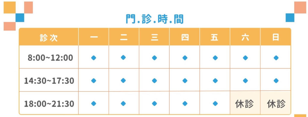 營業時間 8:00~12:00 14:30~17:30 18:00~21:30 一至五全日看診、六日夜診休診